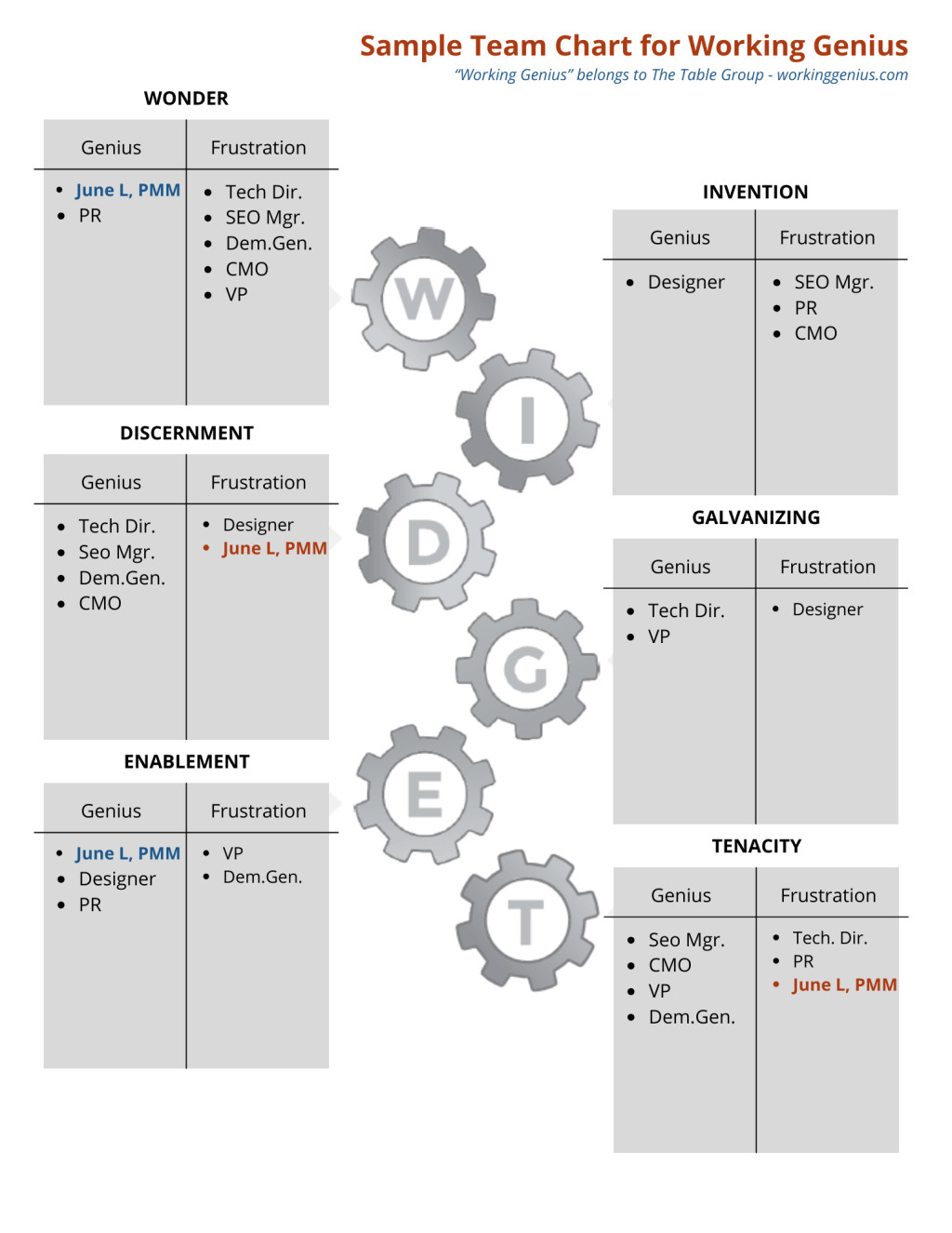 Here’s a sample team chart that The Working Genius gives your team once everyone completes the assessment. I’ve obviously removed the names of my teammates and used a generic title similar to their roles and flip-flopped some of their data just to protect them. The gist is the same though.