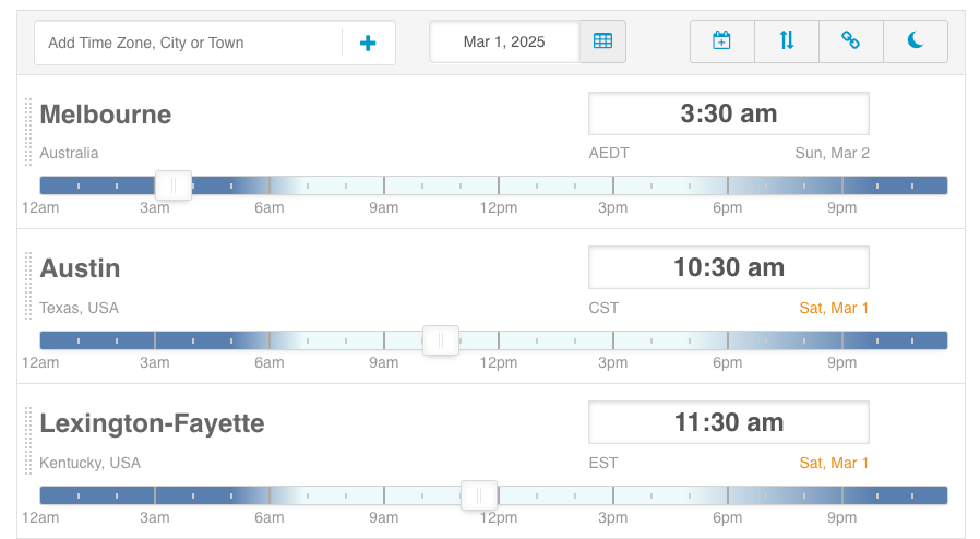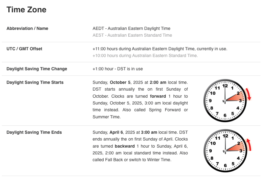 Once my company expanded to Australia, I couldn’t just keep doing time conversions in my head. Australia, like other countries, has daylight savings. However, the fall back and spring forward dates are not the same in every country… that’s a lot to keep track of.